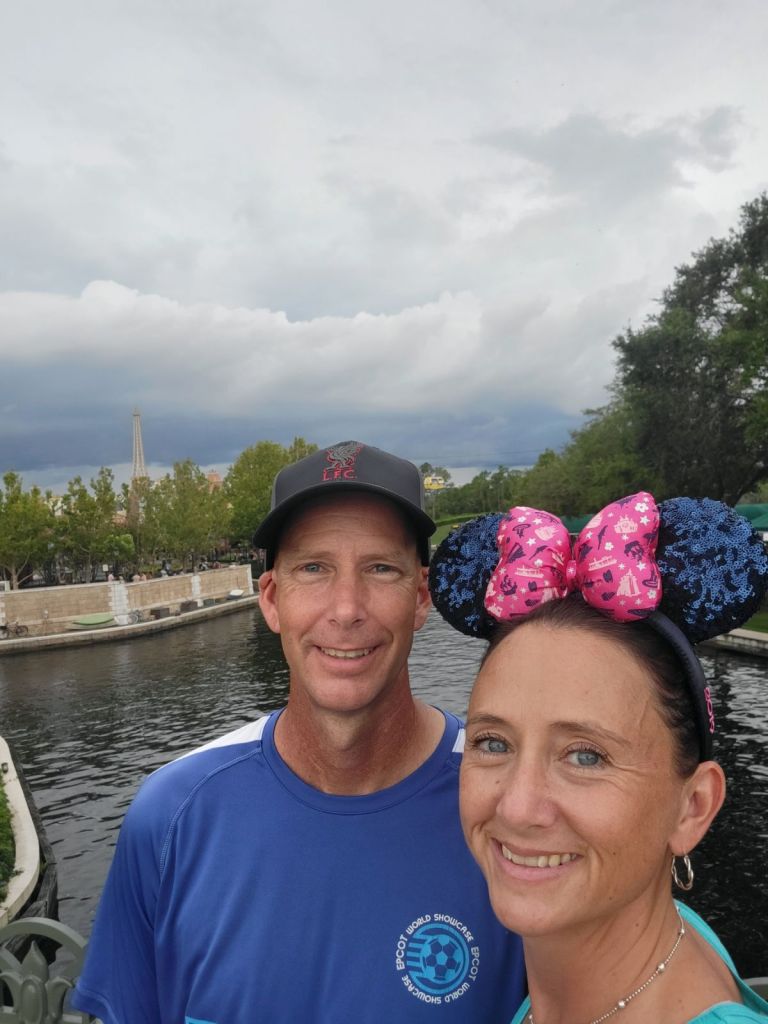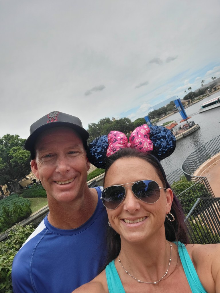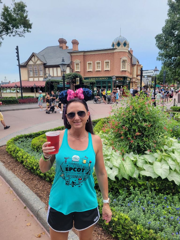 The next day, he wore his Epcot shirt and mine says “Today’s Forecast Epcot with 100% chance of day drinking”. Minnie was talking pictures when we came in the park, so we had to stop and get one! Funny story, we were taking a picture with Minnie in Magic Kingdom years ago, when we noticed that Minnie had hairy legs as we were walking up to the character. Greg whispered to me ‘maybe Minnie is a dude’. Minnie heard us and shushed us, then laughed!! Fun times.