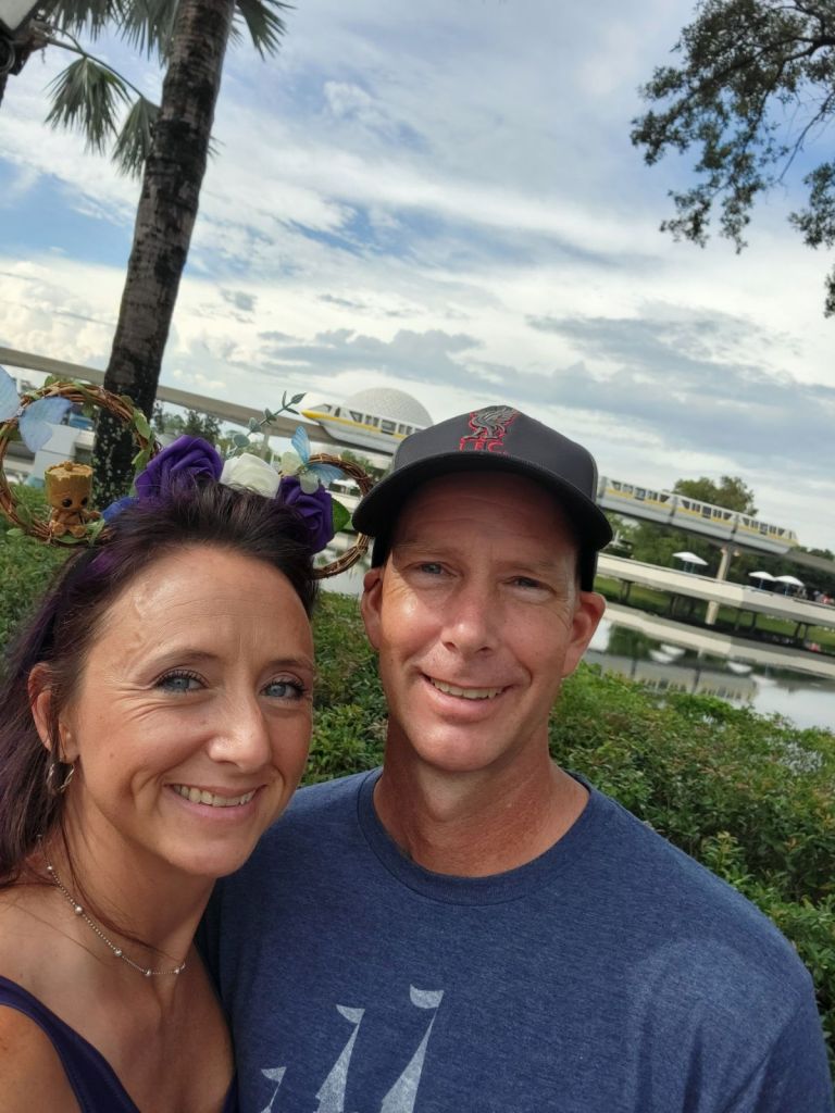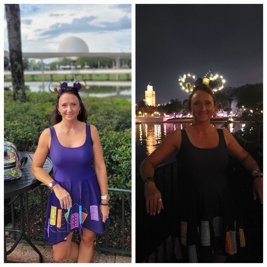 The next day, I wore the special Disney dress I also ordered off Etsy. It is purple with the doors from Monsters around the bottom. I sent a picture of me wearing it to the lady I bought it from and she now uses it for showing what the dress looks like online! I’m famous! lol… Greg had a traditional castle with Walt and Mickey in front to wear. We got the best picture with the Epcot ball and the monorail in the background!