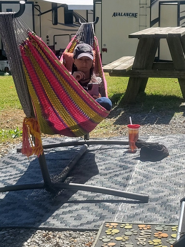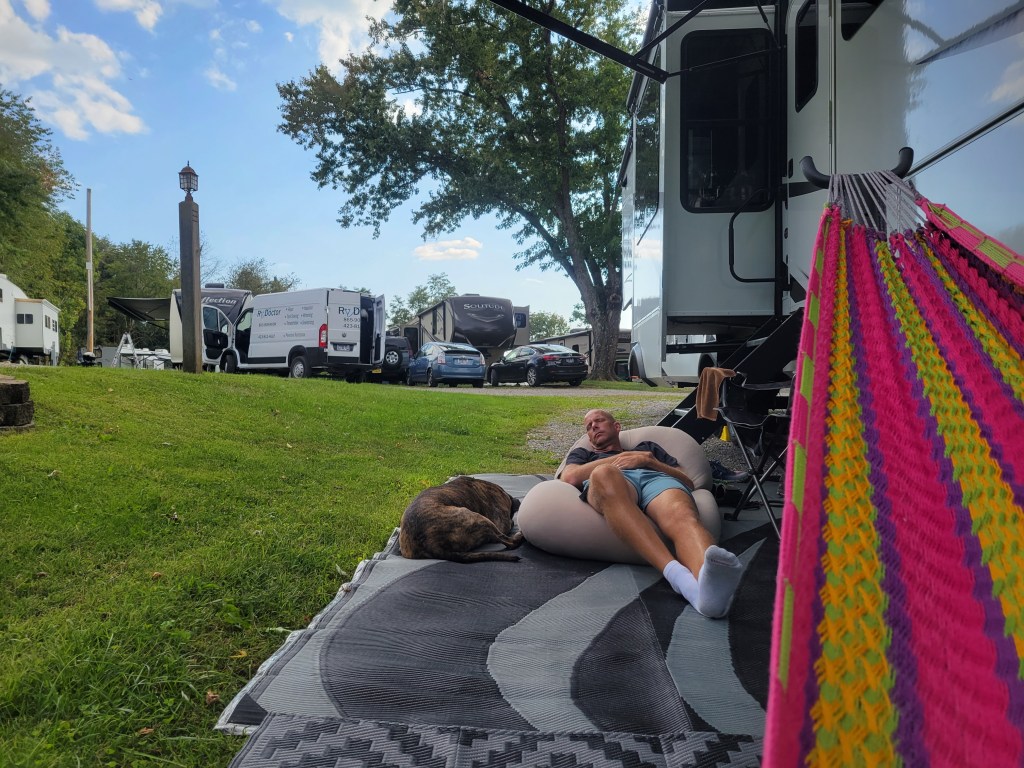 Lazy Llama Campground in Chuckey, TN is a small campground with just over 40 spots total and is located next to a llama farm. While it used to be the same owner and there were visits and hay rides the campers could take, that is no longer offered. However, the llamas are still there, just on the other side of the wire fence and are consistently out grazing. The location is just off the highway, and the camp manager talked me through the best way to come in and park in our very long, pull-through (easier to park than backing in) spot. The manager allowed us to add another week onto our stay since we didn’t know our time frame around the broken fridge drama.