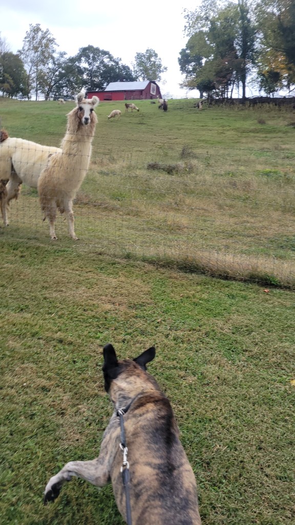 Tigger has loved the wide open spaces to run, play frisbee and ball, and is very intrigued by the llamas. One day, there was a llama decently close to the fence and when we walked over, Tigger had a staring contest with it. Of course I took a picture.