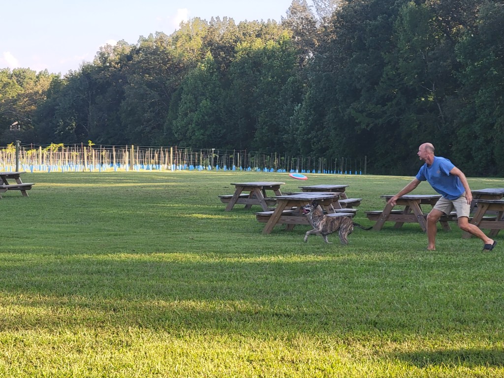 Our next place was Del Monaco winery, about five hours away. We arrived a couple hours before they closed and parked in the provided gravel lot. We enjoyed a couple wine flights with cheese and crackers, while Tigger laid in the cool grass and enjoyed a game of frisbee. It was warmer, so we stayed outside for as long as possible since we couldn’t use the AC to cool down Maverick. Still unsure of the leveling situation, we didn’t even put the slides out, just moved his car bed to the hall, made sandwiches, and called it a night.