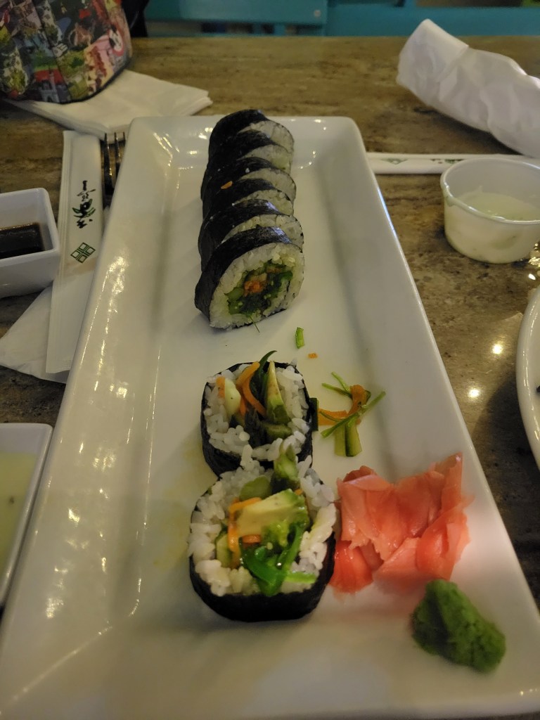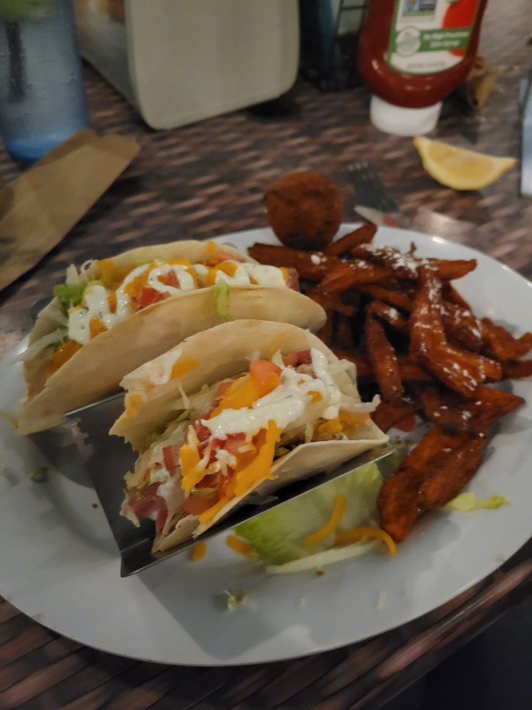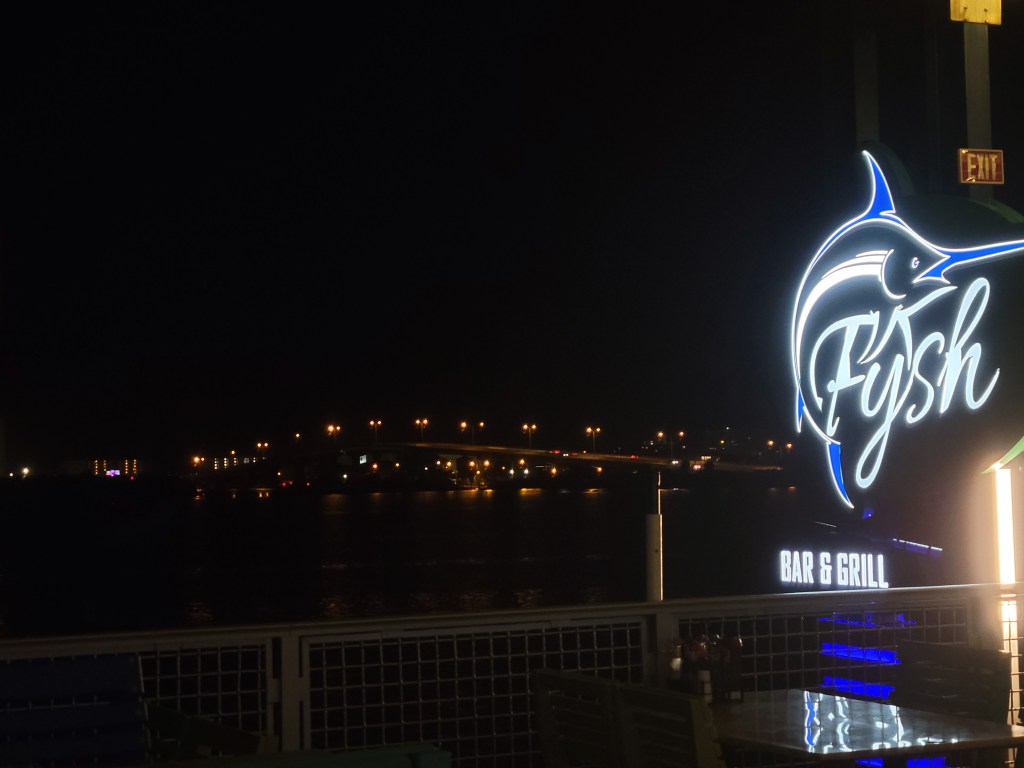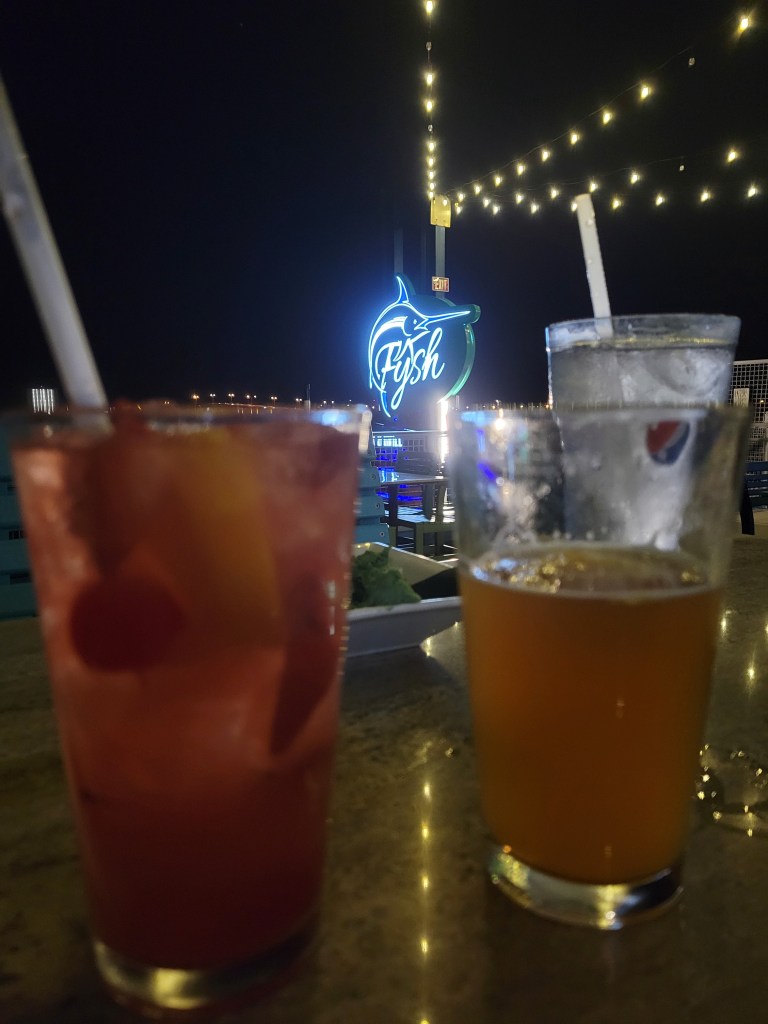 The second night we dined at a new place on the Halifax River, Fysh, recommended by our new friends. It was a gorgeous evening so we opted for the upstairs deck and enjoyed the sunset, fun drinks, and incredible food. We enjoyed some sashimi and sushi rolls with our drinks (Greg had a Blue Moon and I chose a fruity Sangria). For dinner, Greg had a delicious blackened mahi salad (that took two additional days to finish) and I had the most interesting dish – brisket ravioli. I didn’t love it, but I couldn’t stop eating it.
