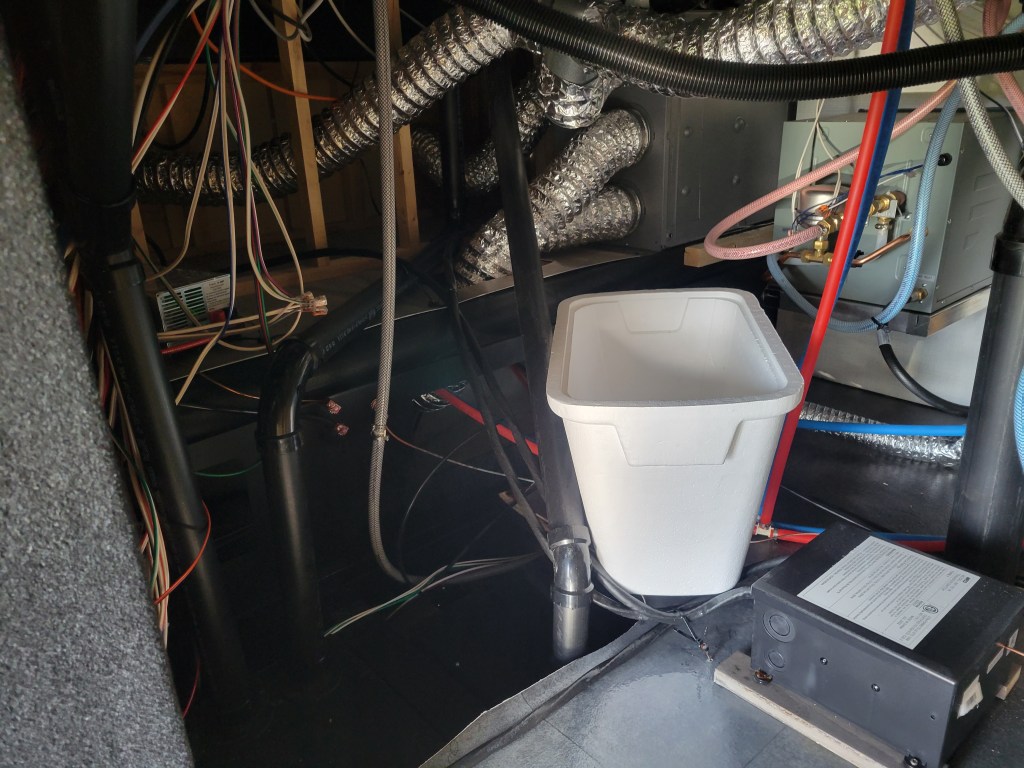 Maverick was about 3 months old when we went down to Florida to stay with family and “winter”, like proper snowbirds. About 3 weeks after we arrived, I heard dripping coming from under the camper. Checking under the camper, I noticed the underbelly looked like it was sagging and holding a lot of weight.