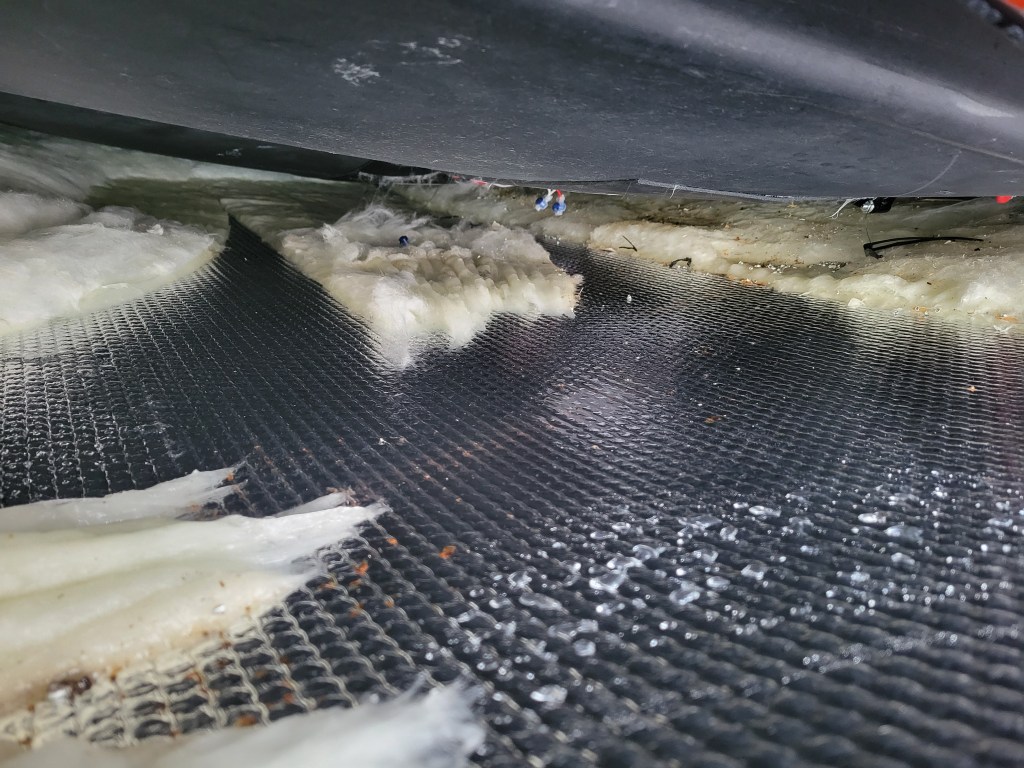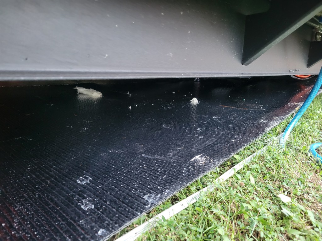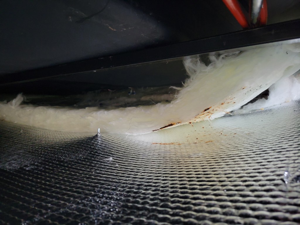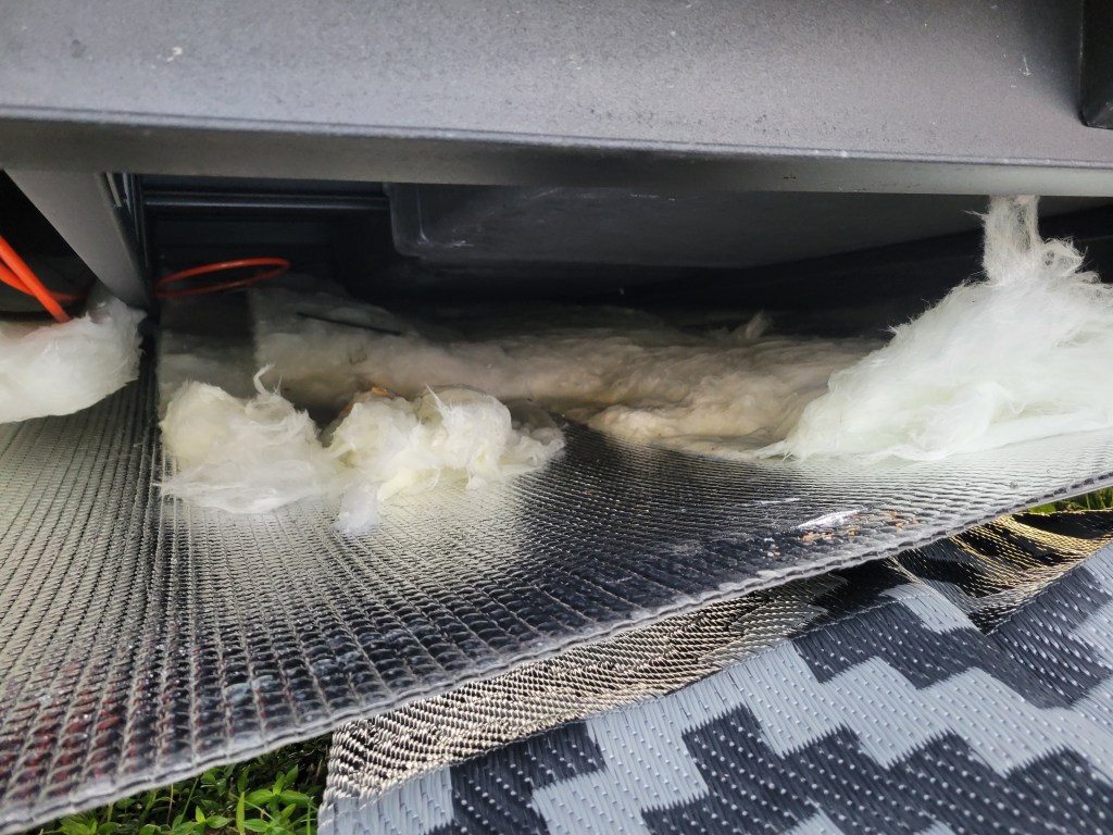Now to deal with the damage. I unscrewed the bolts holding the underbelly up so I could remove any wet insulation. It was all wet. As in, I had to wring out many pieces before I threw it away. A trip to Lowe’s later, and I had insulation to install before securing the underbelly (minus the 2 missing bolts) once more.