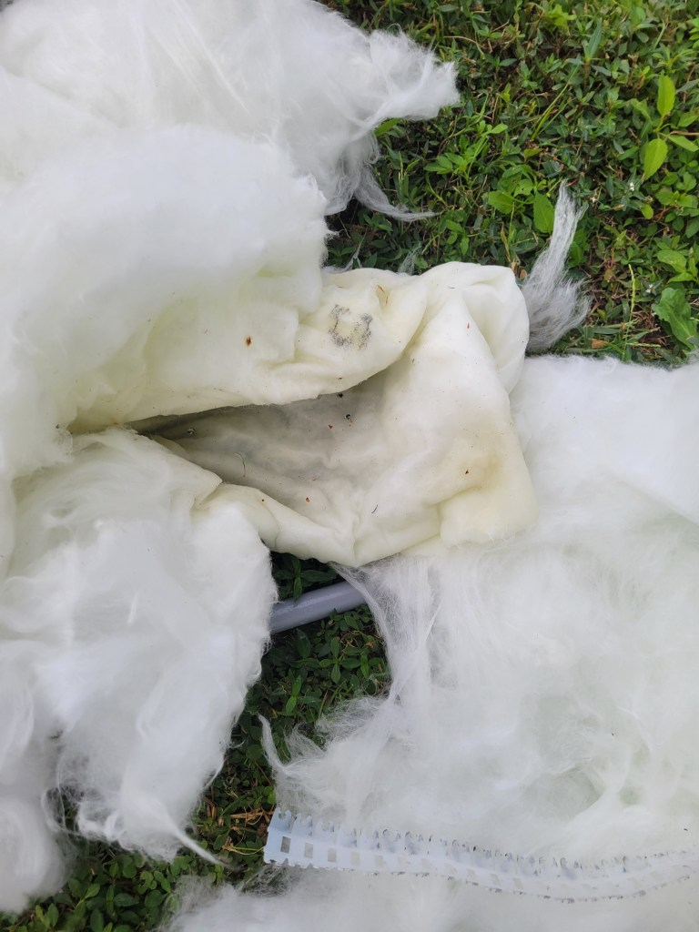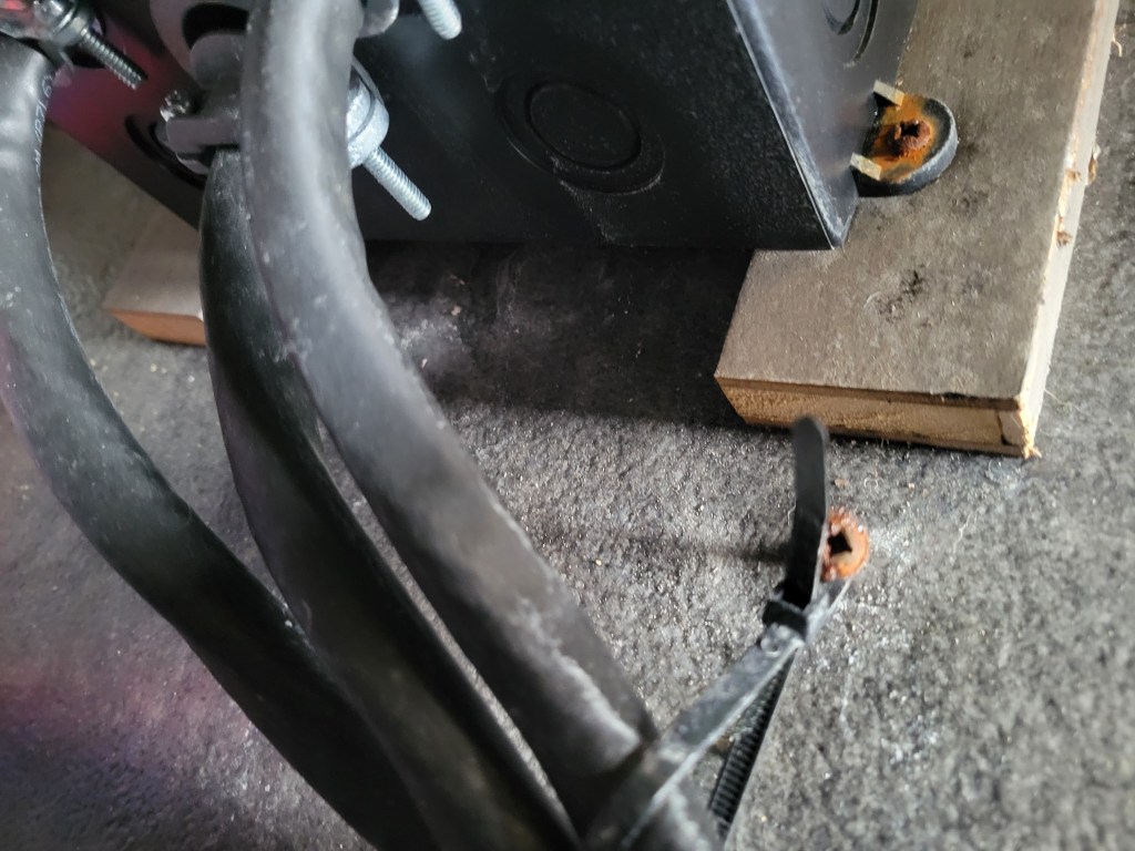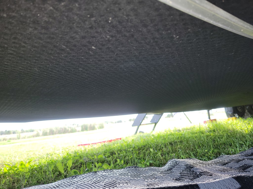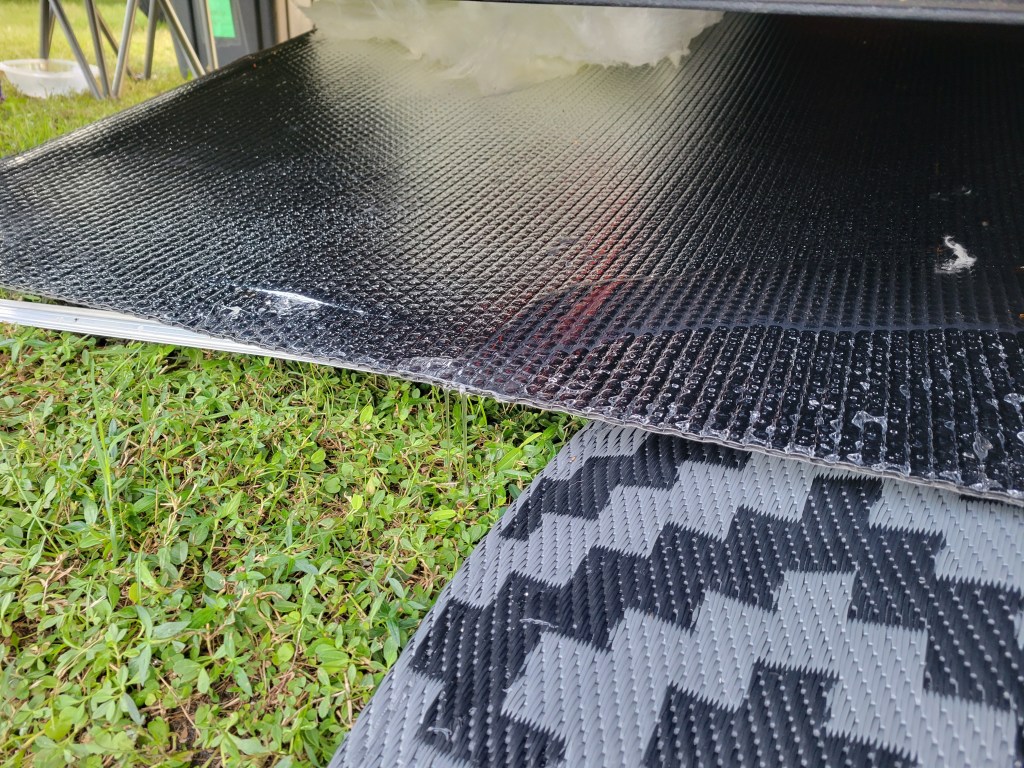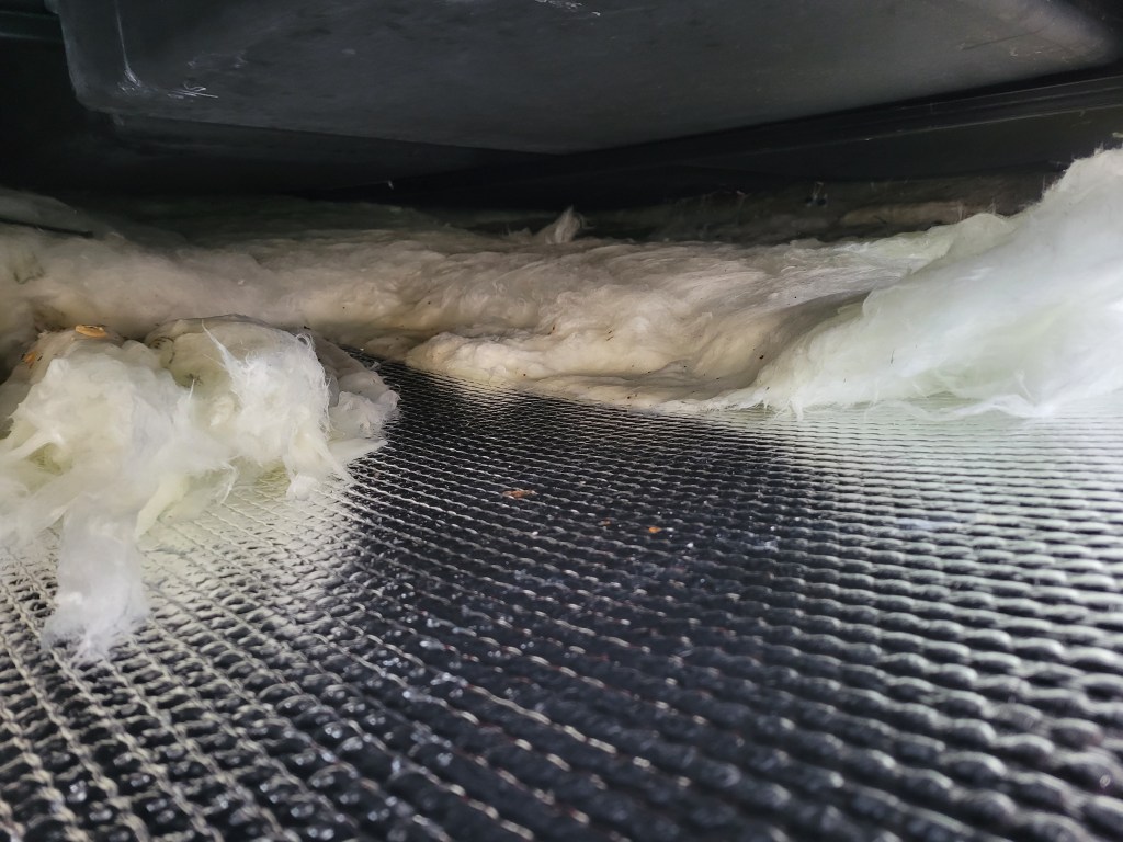 Now to deal with the damage. I unscrewed the bolts holding the underbelly up so I could remove any wet insulation. It was all wet. As in, I had to wring out many pieces before I threw it away. A trip to Lowe’s later, and I had insulation to install before securing the underbelly (minus the 2 missing bolts) once more.