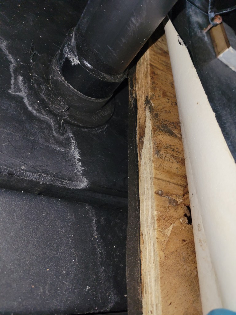 White spots showed where water had been and dried. The wood (walls and exposed subfloor) showed the water damage. Climbing into the compartment with a flashlight, I found the water had dripped down into the underbelly and soaked through all the insulation, stretching out the underbelly lining. So much damage.