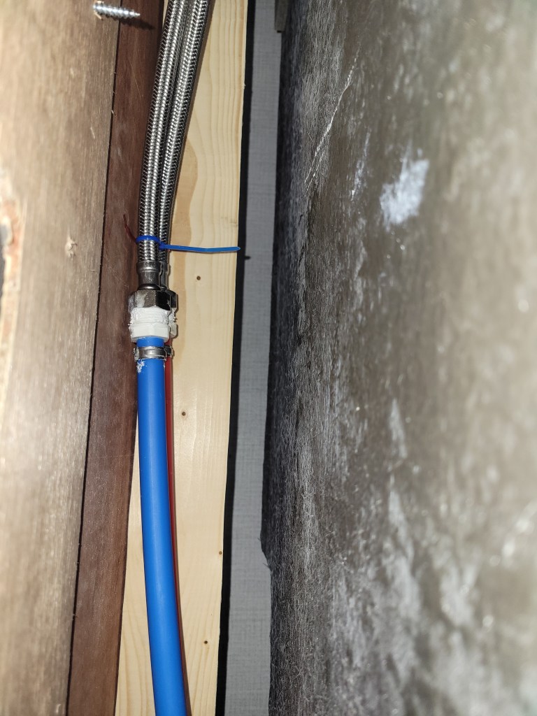 We shut off the water and called a local mobile tech, who could (Praise Jesus) come out the next day. Long story short, while being built the PEX pipes behind the shower wall had been cross threaded into the shower pipes. What started out as a tiny leak went undetected for 3+ months and was no longer a tiny leak. The mobile tech had to make a new opening in the cabinet behind the shower wall to fix the pipes, so at least that part was done.
