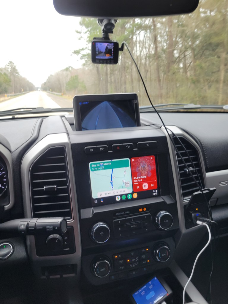 The screen on Pearl’s dashboard is used for maps and Spotify, played through Android Auto. Sometimes, when there are multiple turns/directions, I tell Pearl she is being mouthy. Maybe driving alone all the time isn’t the best idea if I’m having conversations with the truck…