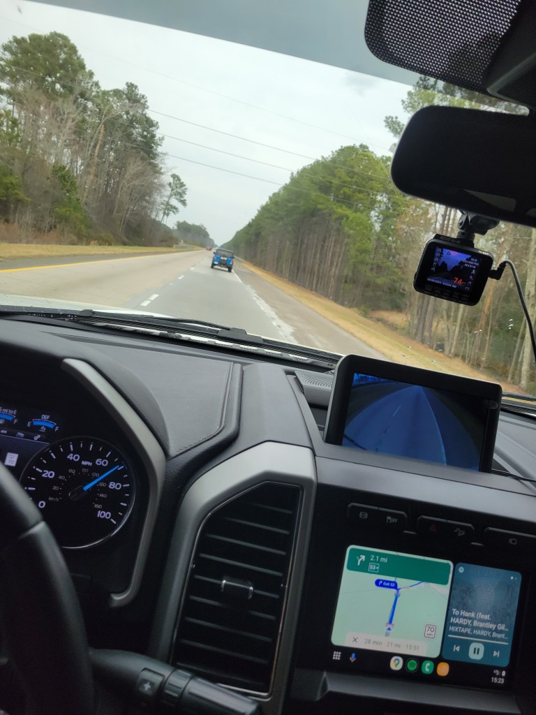 The top little screen is my Rove camera. This tool has a couple functions that help whether I’m pulling Maverick or not. It will record on a 3-minute loop at all times, so (God forbid) if there is an accident (whether we are involved or not) we have a recording of the incident. It also triggers the recording when the truck is off, but jarred enough to help in case of theft. Finally, if you’ve heard me talk about Pearl, you will know that I refer to her sweet wheels as sexy legs. They are 37″ Venom Power tires on 22″ Fuel wheels. Sexy legs. When the tires were installed (before I bought it), they didn’t calibrate the speedometer to the tires, so when Pearl says I’m going 65 mph, I’m really going 72 mph. The Rove camera tells me how fast I am actually going.