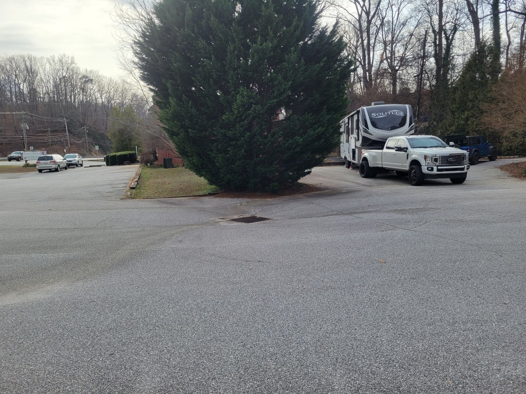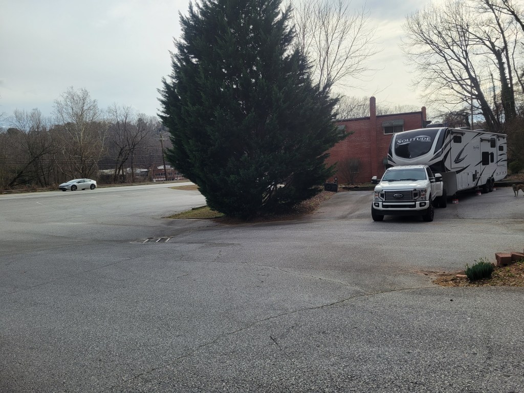 We knew there was going to be lots of rain in the area (thank you, Greg), so the final night on the road I wanted to make sure we were able to park on pavement. A Boondockers Welcome Host offered the parking lot of their real estate office, so I booked it. We had access to use the florist’s parking lot in front so we could back in behind the tree, and use it we did.