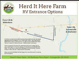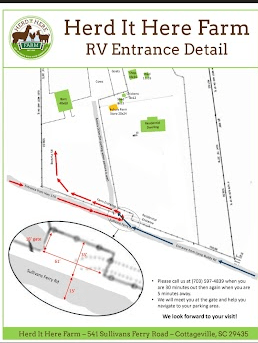 That night we used our Harvest Hosts membership to stay at Herd it Here farm, an agritourism farm with a llama, alpacas, mini cows, a mini donkey, a mini pony, and chickens. The host, Bill, gave great detailed instructions on the best way to pull into the farm since we were a big rig and there was no way we were making that hairpin turn. On the Entrance Options map, I had to take the blue route off Cottageville Hwy. It didn’t seem too bad in the planning, so we went for it even though it was the longer way around.