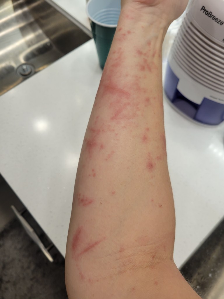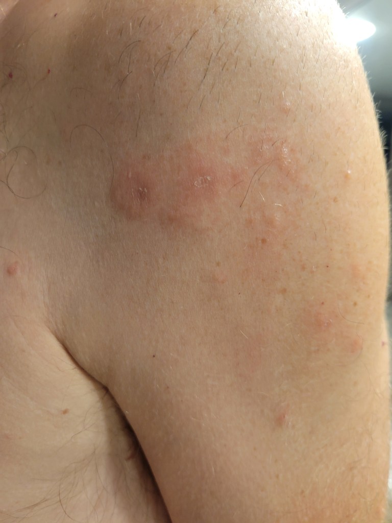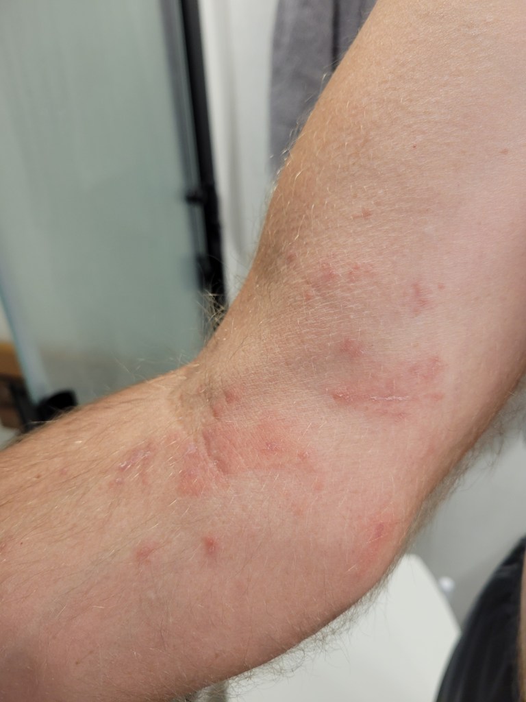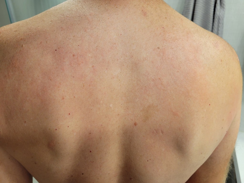Greg isn’t into documenting his progress as much, but he did allow me to get a few photos of his reaction to share. You can see from the photos his spots are bad, but thankfully they don’t look too angry or infected. He said every day feels better for him.