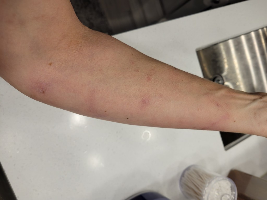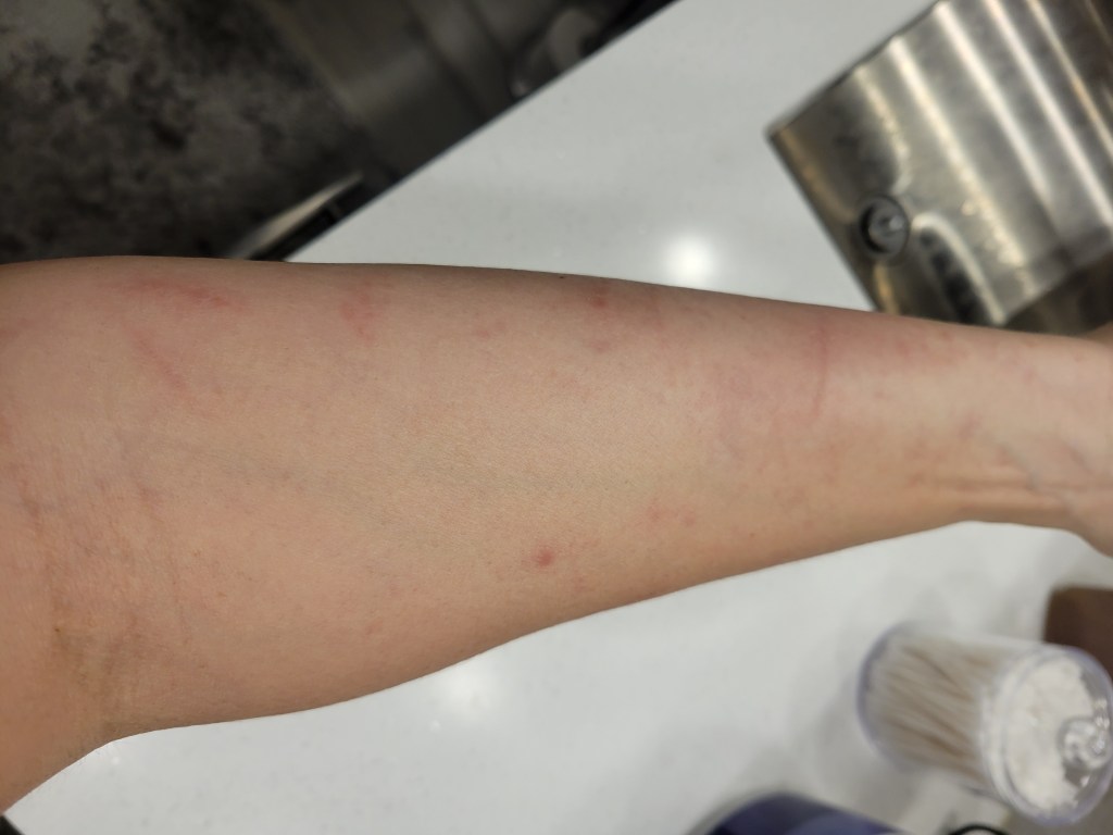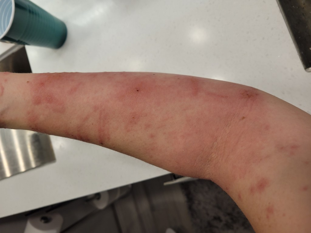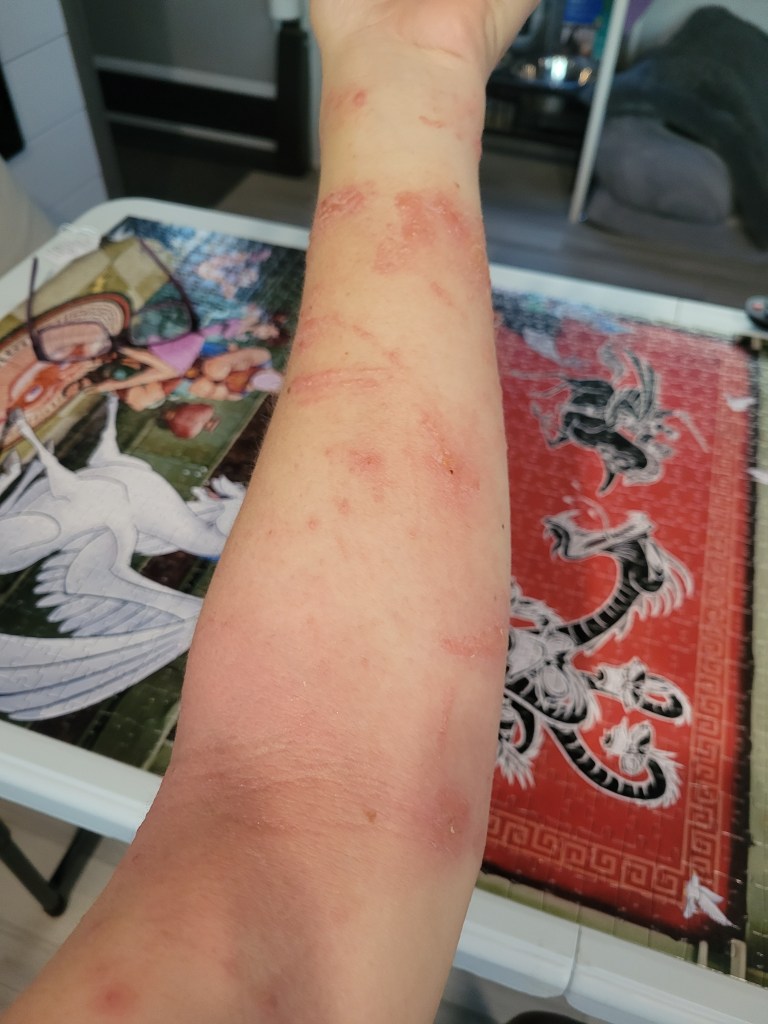Greg isn’t into documenting his progress as much, but he did allow me to get a few photos of his reaction to share. You can see from the photos his spots are bad, but thankfully they don’t look too angry or infected. He said every day feels better for him.