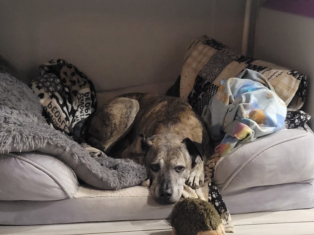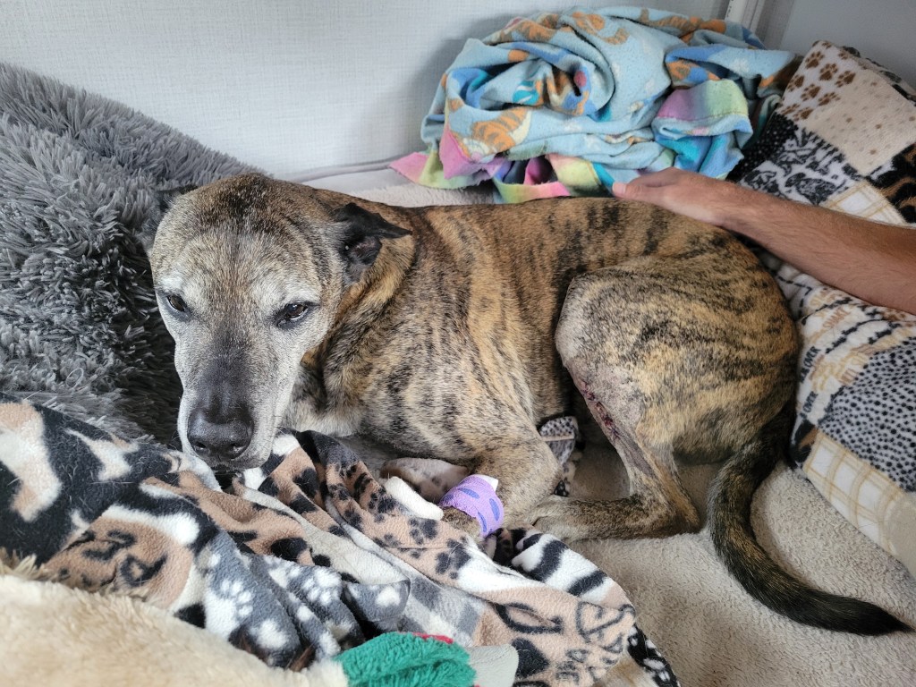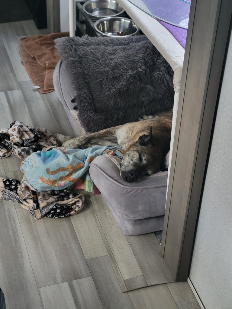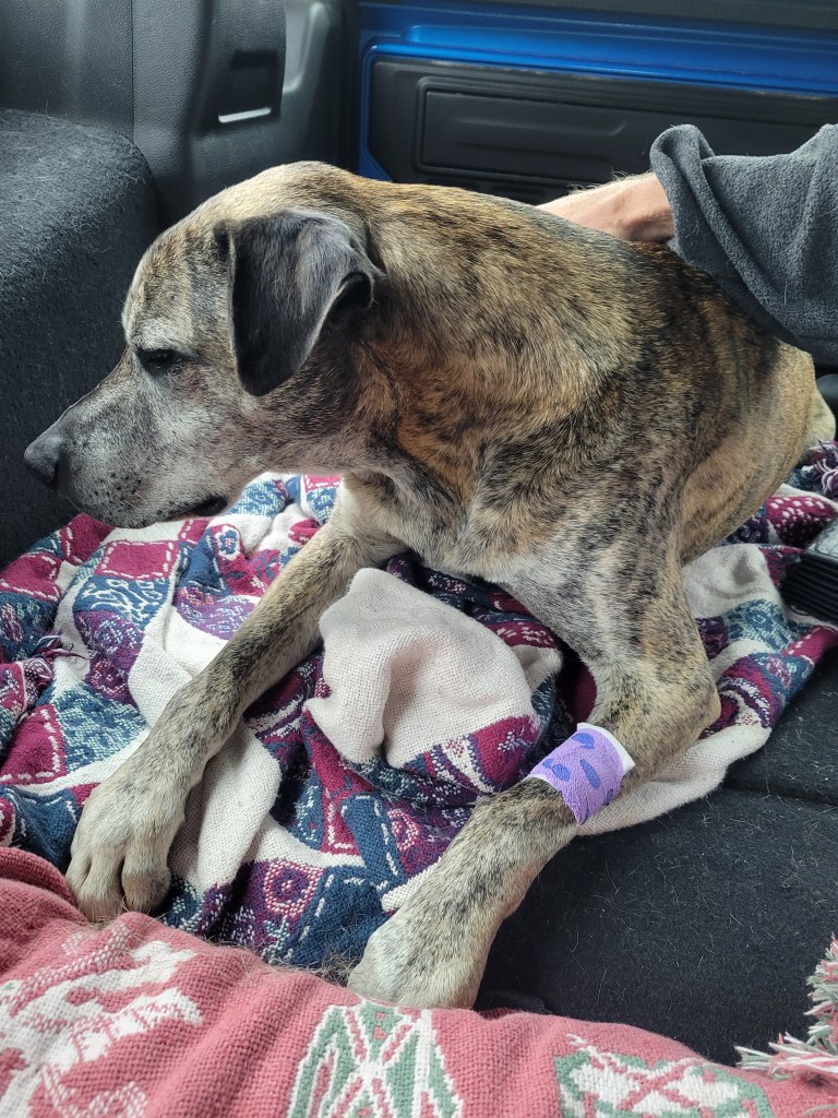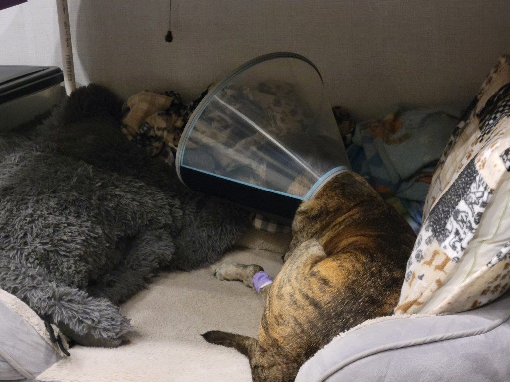 Tigger was anxious, but walked back to the surgery room with the vet tech that morning. We got a call from the surgeon about 12:30pm saying everything went textbook perfect. They were able to remove the entire lump and there was enough skin to stitch it up without it being too tight. We were allowed to come get him anytime after 3pm, so we were there at 3pm. He was SO lethargic, it was pathetic. Greg sat in the back with him, so he didn’t try to stand on the drive home. Coming home, he went straight to his bed and back to sleep. The purple bandage was where his IV went it.