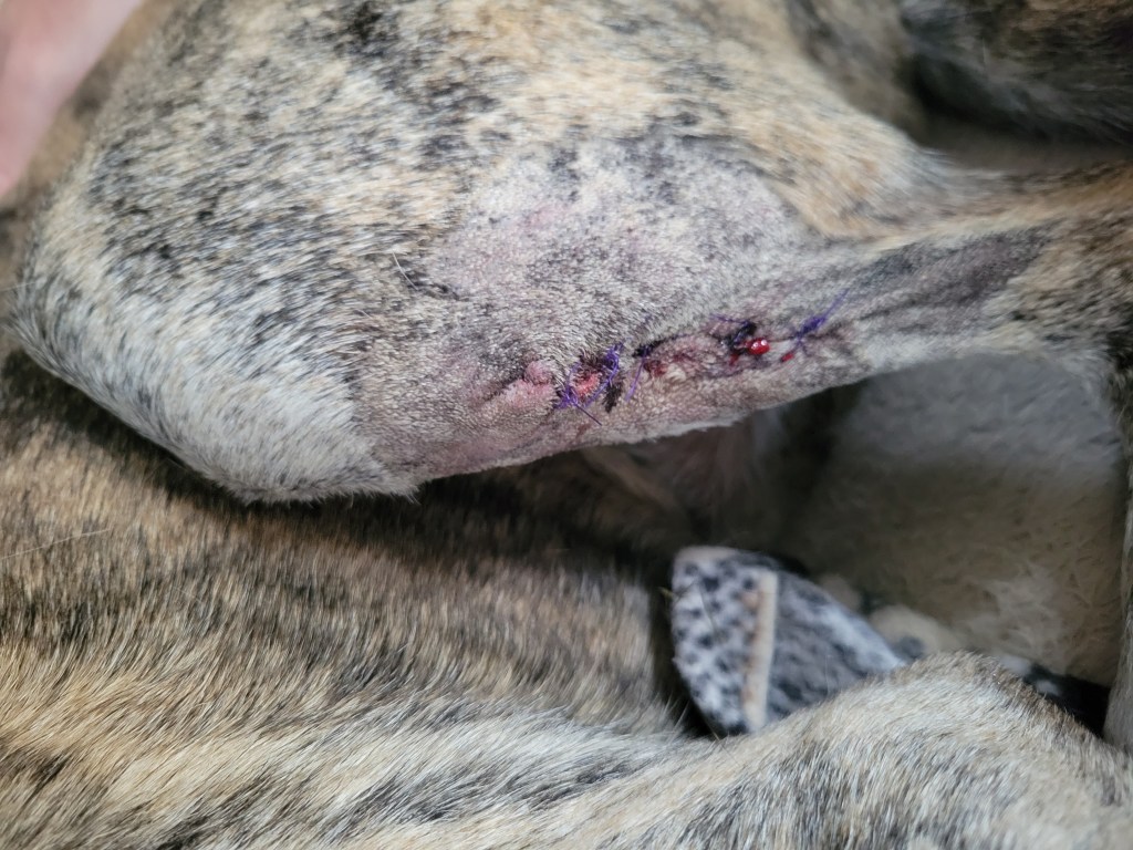 Dr. J (wow, she’s amazing) took 4 samples out of the lump and Tigger didn’t even flinch. She said it was hollow in the middle, and it wasn’t fat cells as she hoped. 4 slides of… stuff… (not that kind of doctor) got sent off to pathology to see what had grown to the size of a golf ball on Tigger’s leg. While the slide looked interesting, we didn’t love the outcome.