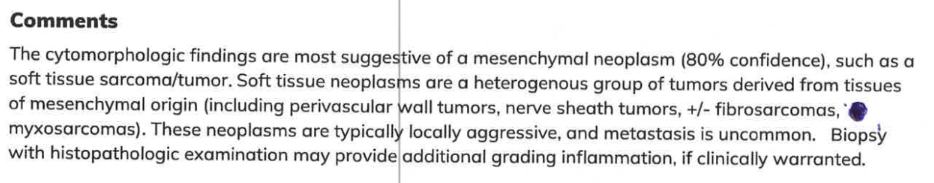 The cytology report came back 3 days later indicating “Probable mesenchymal neoplasia”. Thankfully, Dr. J put into terms I would be able to understand, even though she also sent me the report showing the comments from the lab.