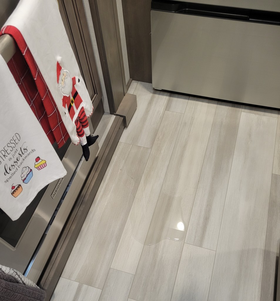 While wintering in Florida this past winter, like proper snowbirds, we discovered there is a leak that allows water to come in UNDER the slide that has the stove on it, and pool on the kitchen floor. If we have the slide closed, it doesn’t leak.