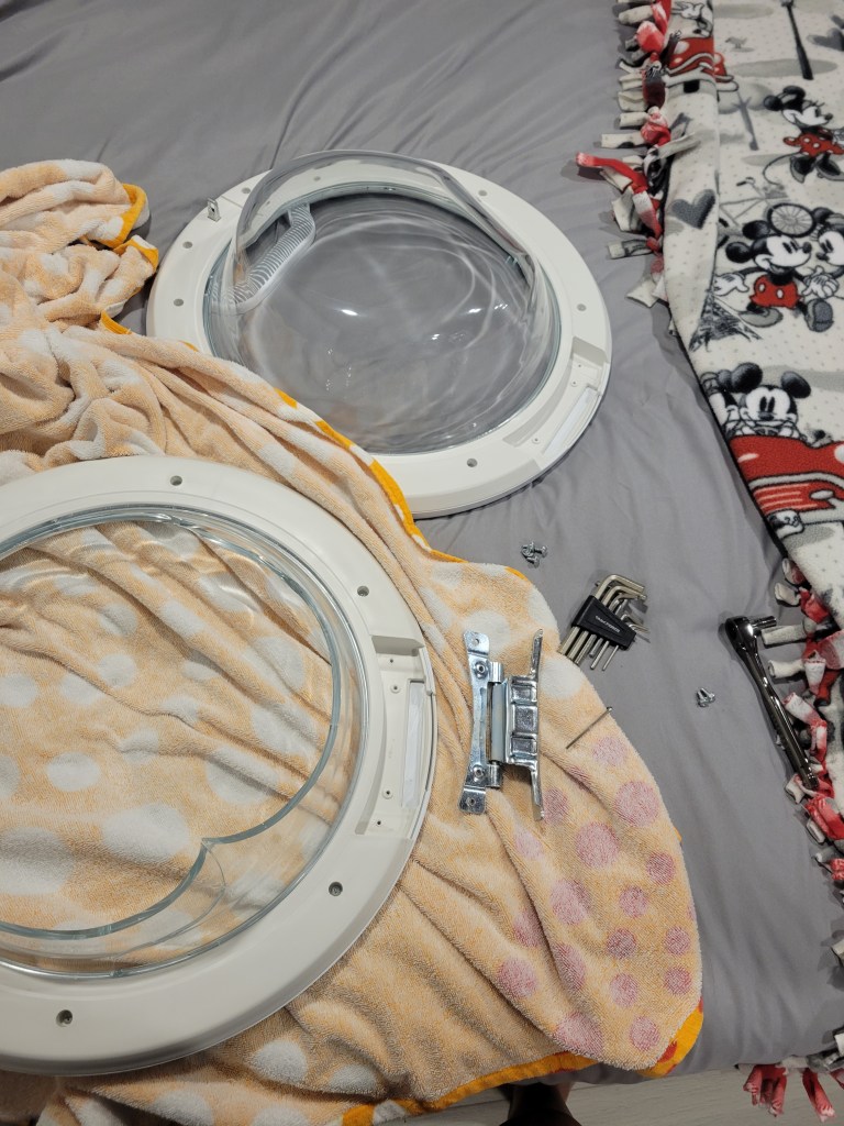 He said he heard a noise in the middle of the night, but thought it was the dog. It would have been muffled because the door to the laundry “room” was closed and the glass had just cracked. He didn’t know it was the washer until he went to use it and the whole center of the glass fell into the washer and the floor in front of the units.